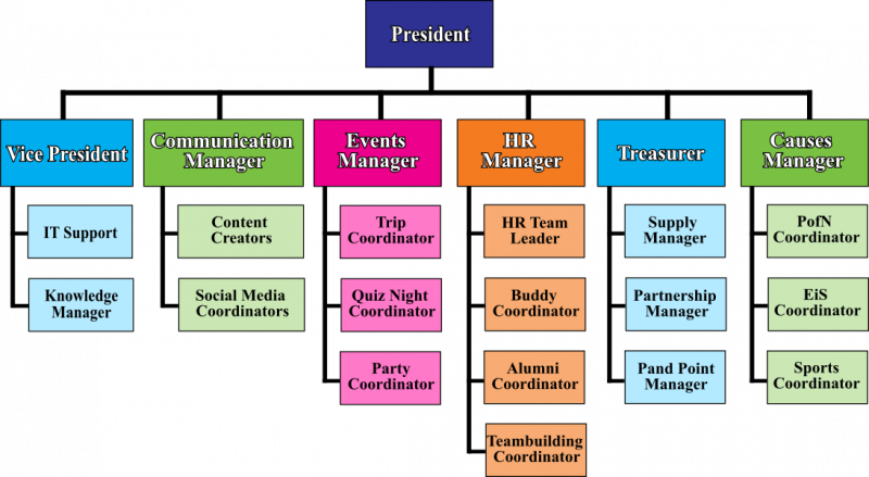The following structure shows which board member is responsible for certain tasks. These tasks are assisted by supporters and coordinators. The president is responsible for the overall running of the board, and supervises and tasks the other board members where appropriate.