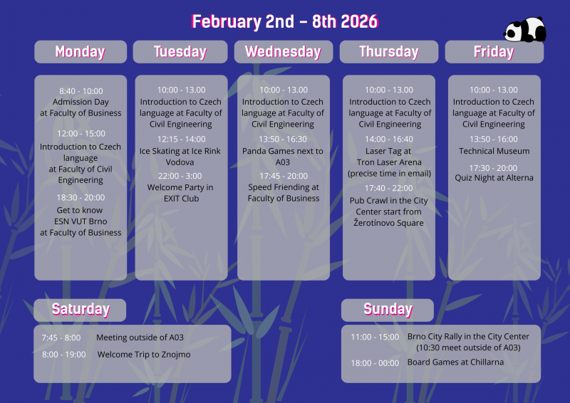 Your Erasmus experience begins on Monday, 2nd of February, with the Welcome Week. That is one week full of events and activities prepared exclusively for exchange students like you by ESN VUT Brno in cooperation with the BUT International Relations Office. Be quick before the spots run out! You can read the descriptions of the events under this table.